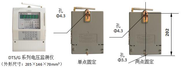 DT5/G系列電壓監(jiān)測(cè)儀的外形如下圖所示,它通常采用單點(diǎn)固定(掛孔上部寬4mm),也可以采用兩點(diǎn)固定。采用兩點(diǎn)固定時(shí),其上下兩點(diǎn)之間的距離為202mm。
